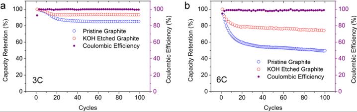 この問題を解決するために、研究チームはグラファイトをKOHでエッチングして表面に穴を開け、Li+の拡散距離を短縮して充放電速度を向上させることを提案しました(図3)。KOHエッチンググラファイトの3C充放電時の容量保持率は93%です。6Cというより高いサイクル速度でも、74%の容量保持率を示すことができます(図4)。